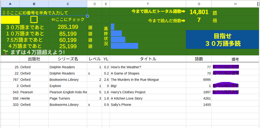 ・それなりに冊数を読んでいる生徒もいるようなので、「これまでにどれくらいの英語を読んだのかを確かめてもらうため」と「10万語まであと何語あるのか」「100万語まであと何語あるのか」を実感してもらうために、グーグルスプレッドシートで作成した図書館にある本リストのコピーを自分のクロームブックに入れてもらい、これまでに読んだ本をチェックさせた。
