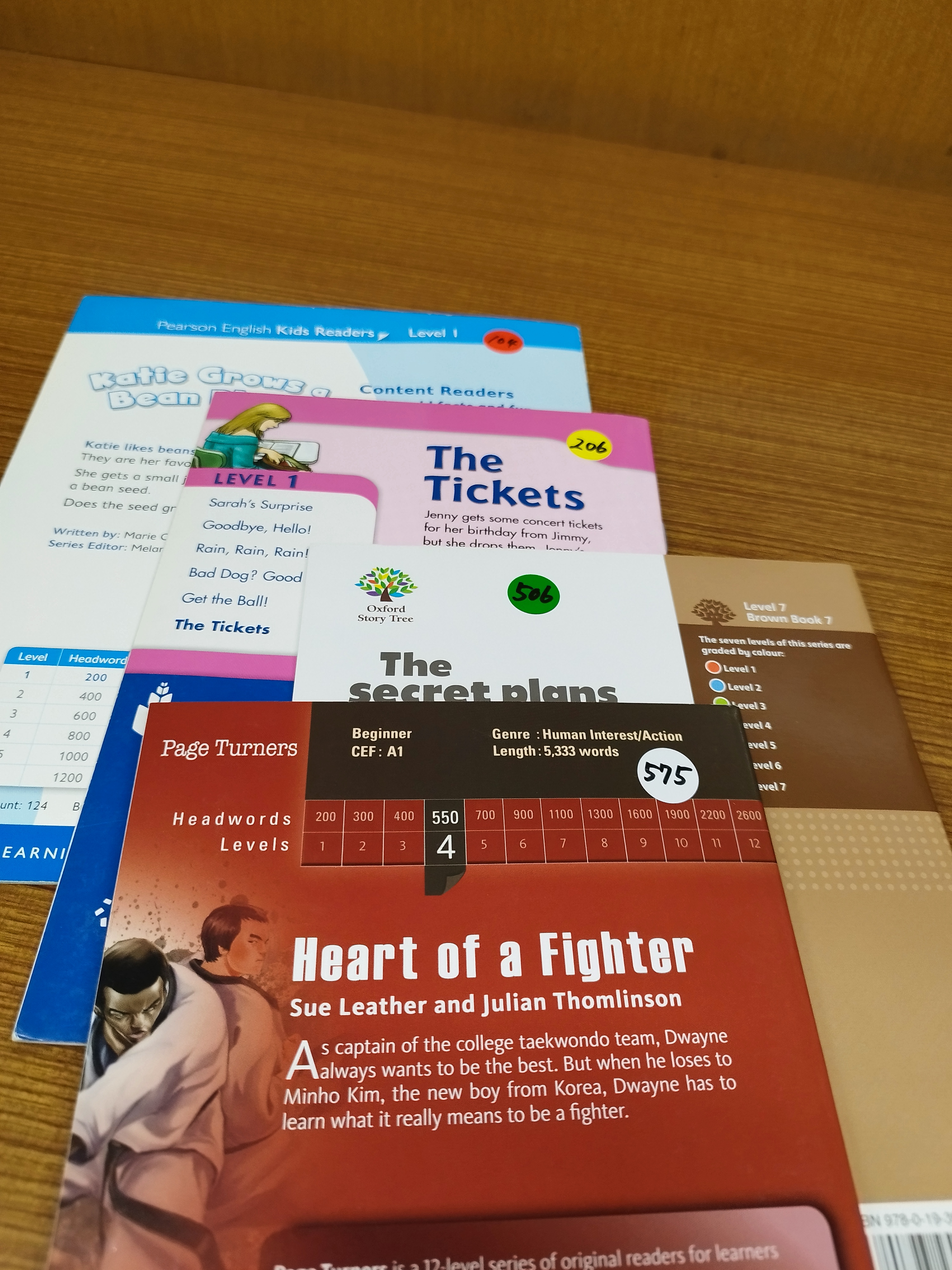 Oxford Bookworms やPearson ReadersのYL0.8〜のもので、1冊の語数が1000語を超えるものを読んでいるようであった。